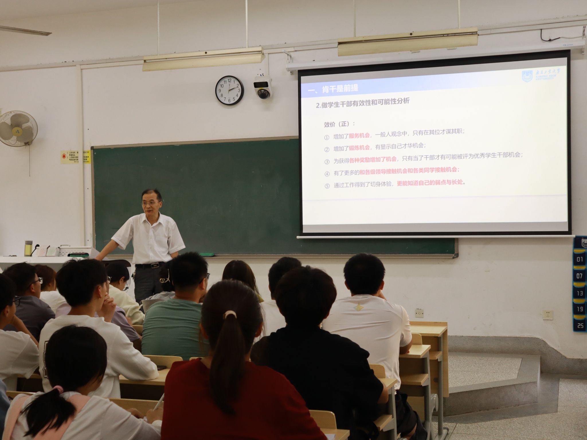 陈书记从“肯干是基础”、“能干是前提”、“巧干是保证”三个方面展开论述。他引入期望理论科学分析个人行为动机水平,指出“肯干是前提”,对同学们做员工骨干的有效性和可能性做出了合理的分析;介绍了员工骨干的工作特点,阐释“能干是基础”继而对员工骨干的品格提出要求,强调员工骨干要有做事、批评和自我批评的魄力;“巧干是保证”要求员工干部掌握工作技术技巧,在管理好班级事务的同时处理好人际关系,嘱咐员工骨干们要在服务中成长,做出正确的人生选择,启发大家服务和成长是辩证统一的。