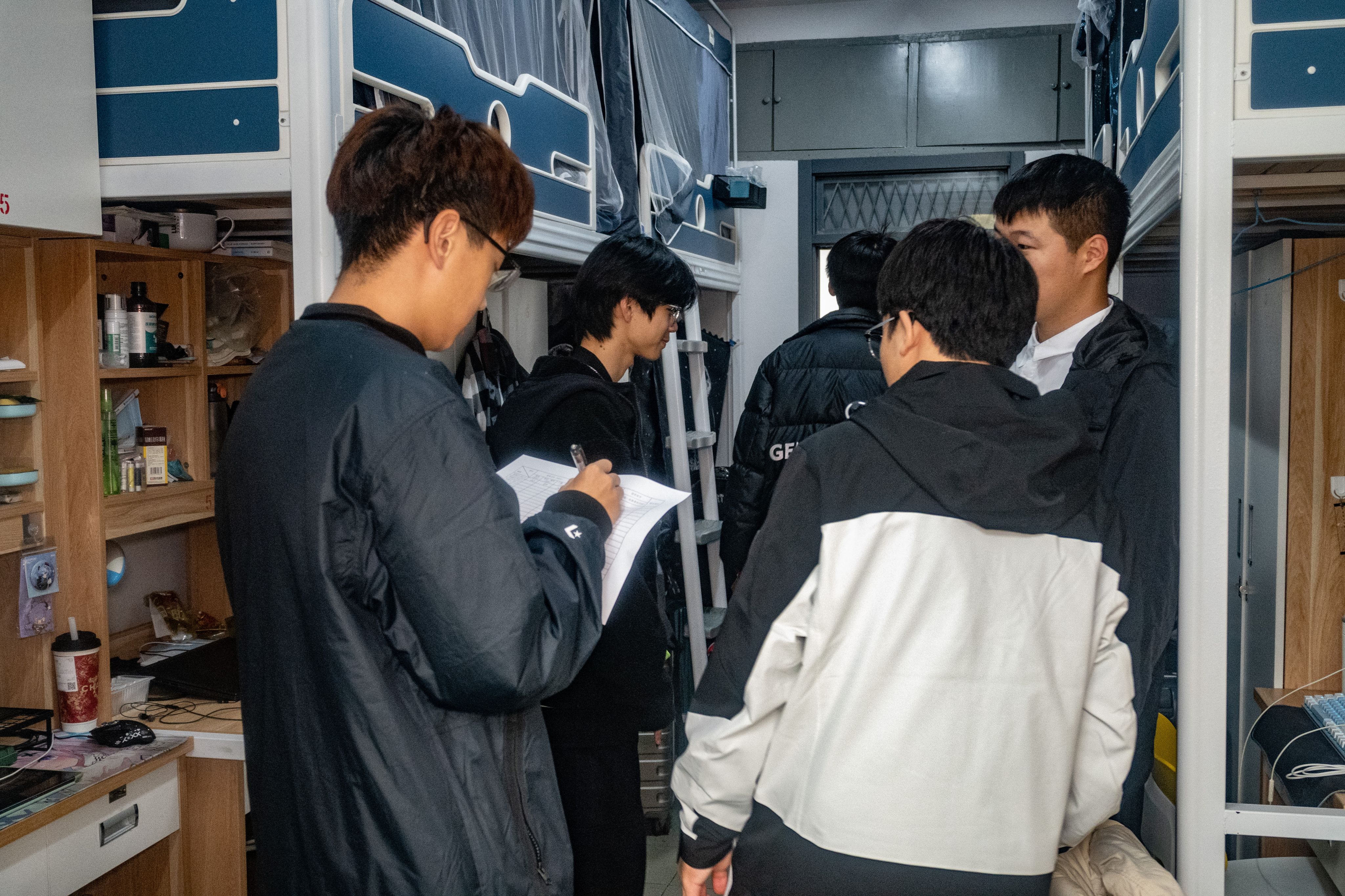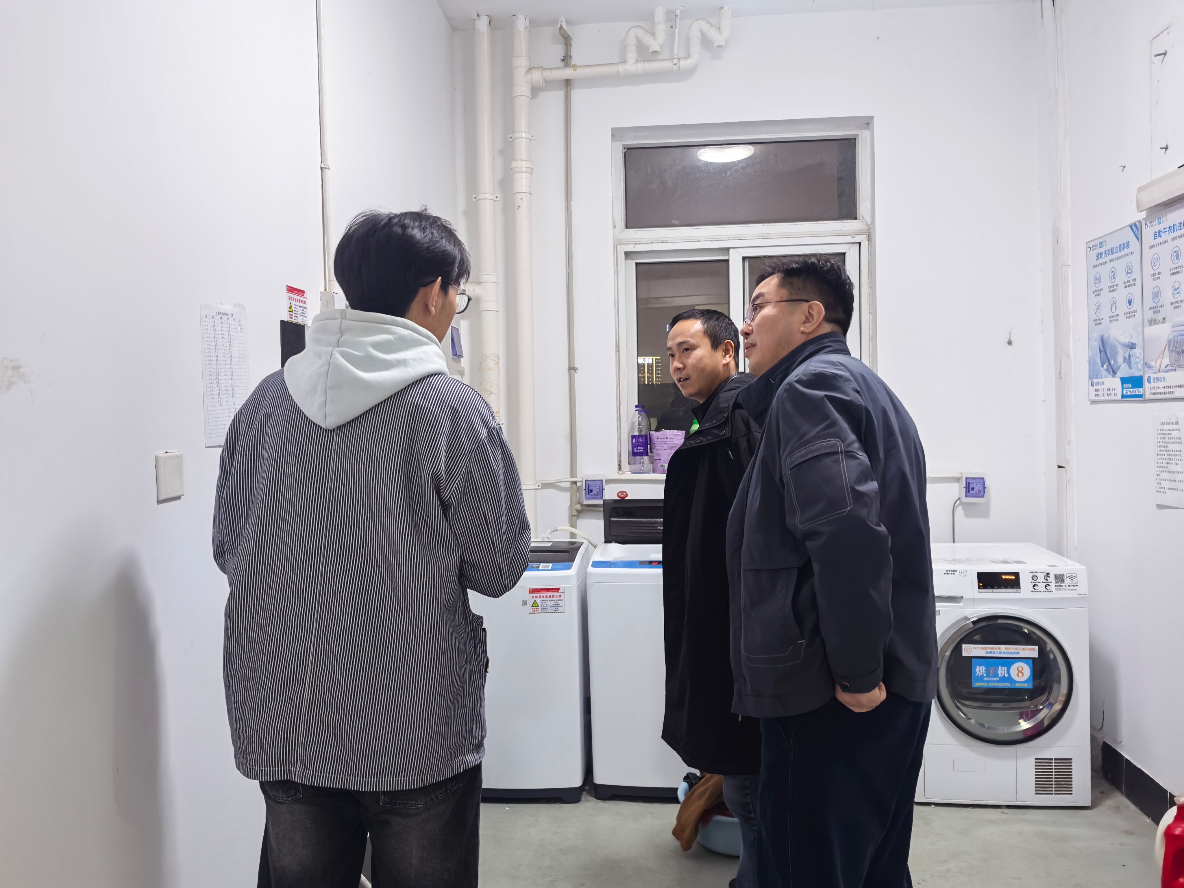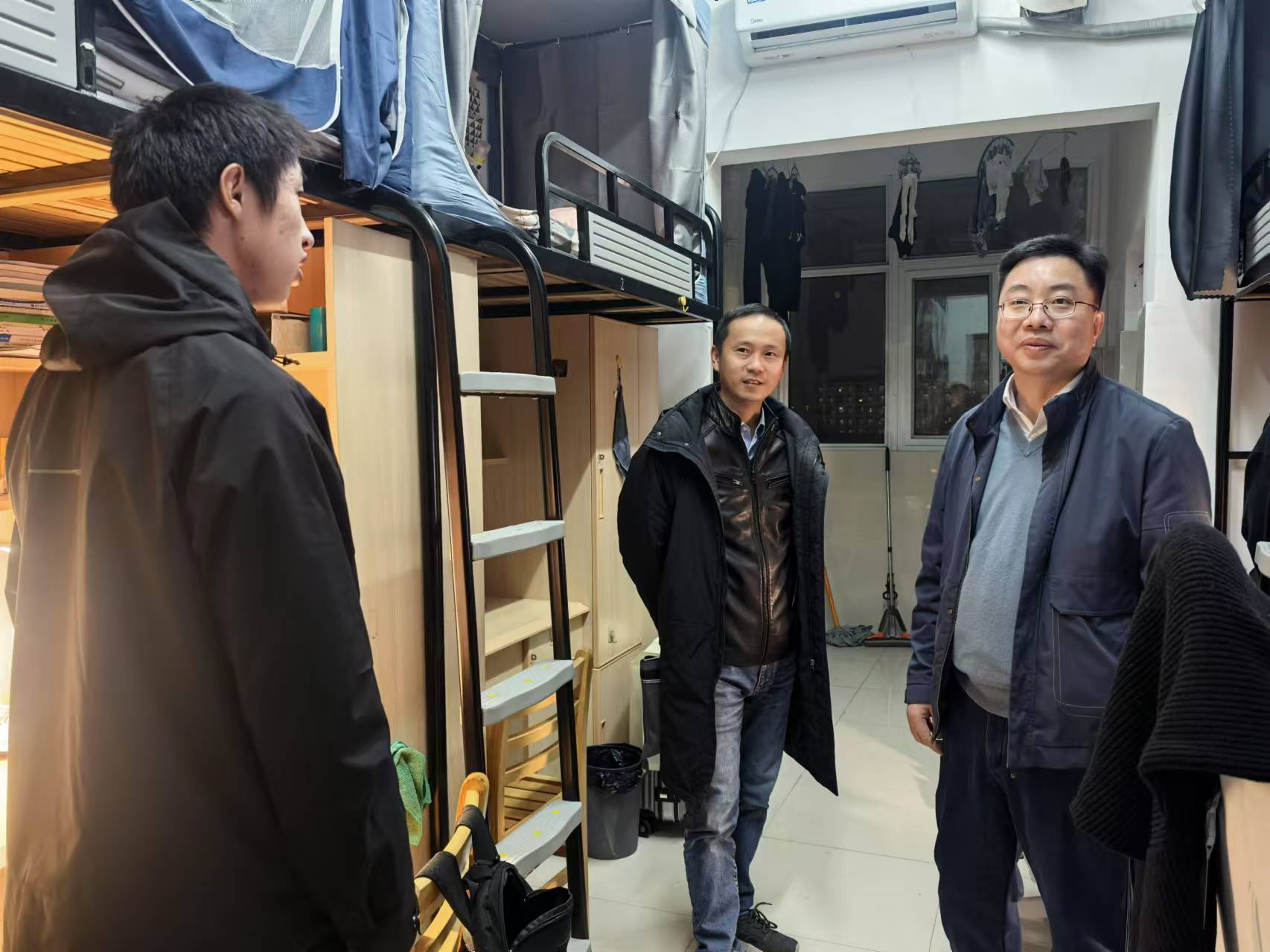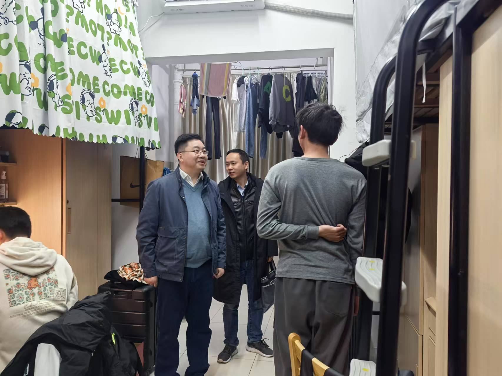 公司党委书记、经理王志荣、副经理邵春雷、学办主任朱永华及辅导员潘枫走访员工宿舍,鼓励同学们要不断加强宿舍凝聚力,积极培养“互帮互助、团结包容”的宿舍氛围。各班班长、生活委员、宿舍长依据《太阳成集团tyc234cc宿舍管理条例》,对宿舍内务整理情况、卫生清扫状况、有无使用违章电器等进行仔细检查,并提醒同学们提高安全意识,促使他们养成良好的生活、卫生习惯。