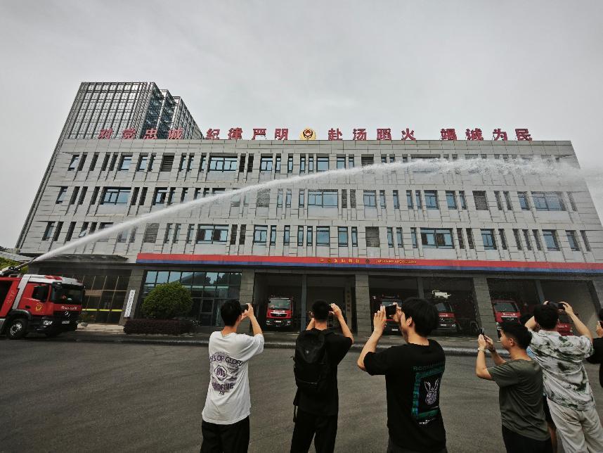最令人兴奋的环节当属消防水炮车的水炮发射演示。随着班长的操作,强劲的水流从炮口喷射而出,在空中划出一道壮观的弧线。队员们纷纷拿出手机记录这一精彩瞬间,惊叹于科技赋予消防救援的强大力量。