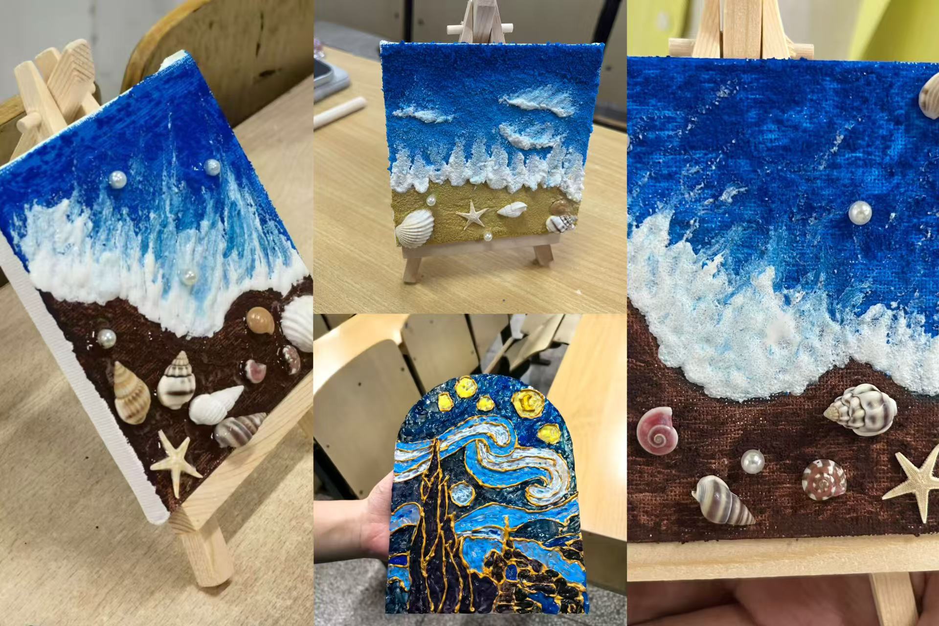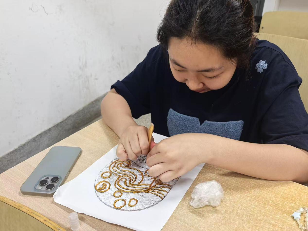 活动现场氛围轻松活跃。在毛毡制作区,同学们互相切磋戳针技巧,将蓬松羊毛精心塑造成精致挂件;沙画体验台前,参与者以指代笔,于流动彩沙间勾勒心中所想;绘画创作区则静中有动,同学们专注挥洒亚克力颜料,在画布上描绘个性创意。创作过程中,指尖的专注与同伴间的交流,成为释放同学们压力的有效途径。