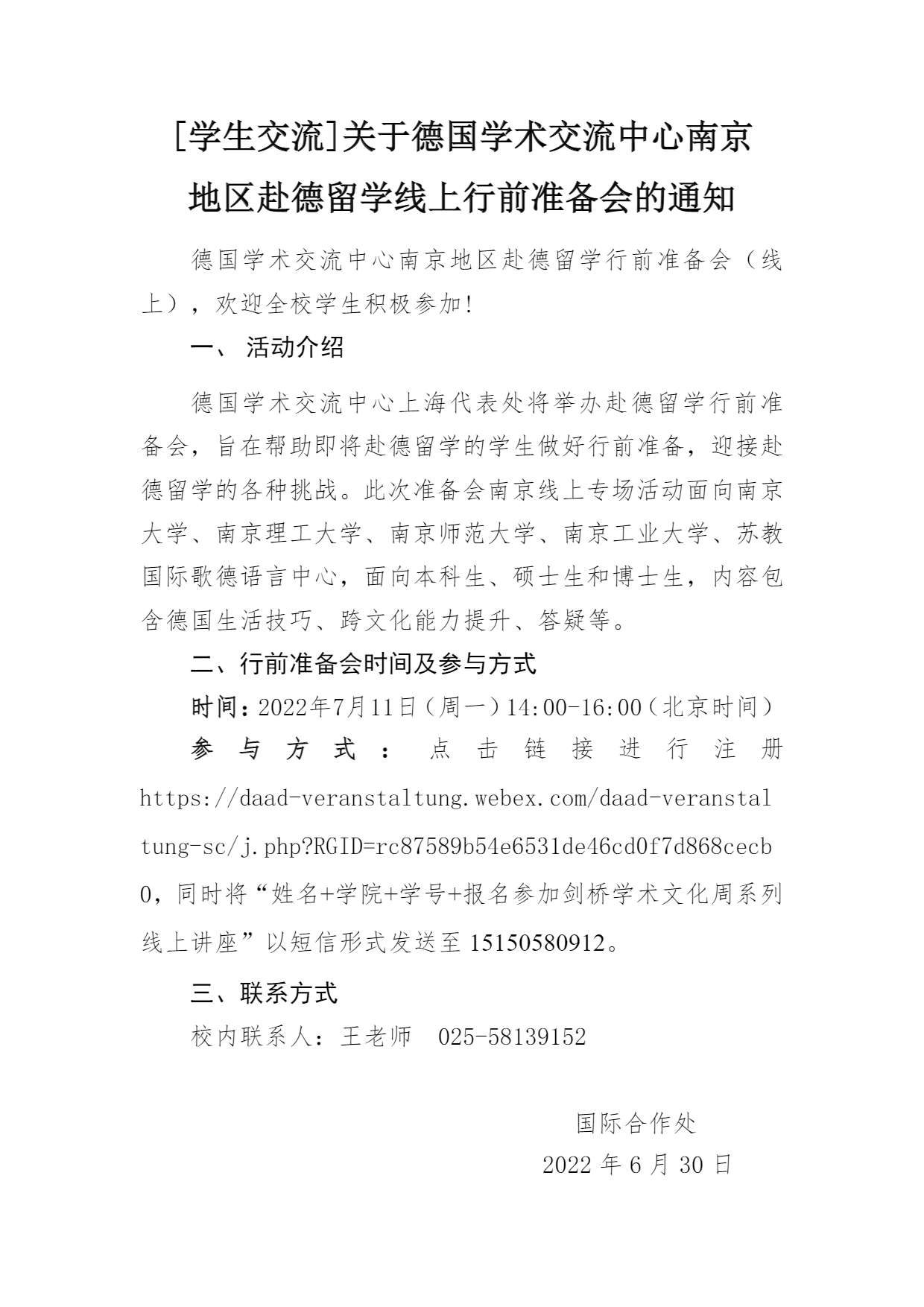 [员工交流]关于德国学术交流中心南京地区赴德留学线上行前准备会的通知