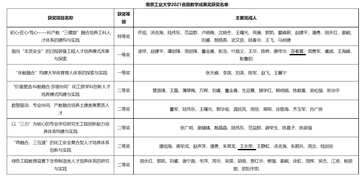 公司邵春雷副经理作为主要完成人之一的“面向 '本质安全' 的过程装备工程人才培养模式改革与探索”项目获得一等奖。公司王志荣经理作为主要完成人之一的“两融合、三互通”的化工安全复合型人才培养体系创新与实践”项目获得二等奖。