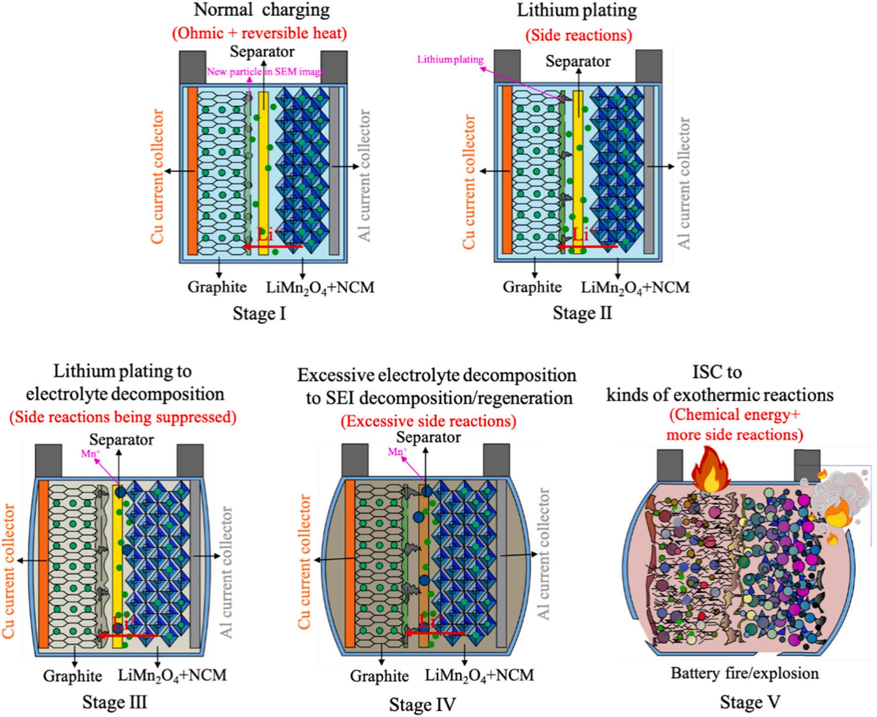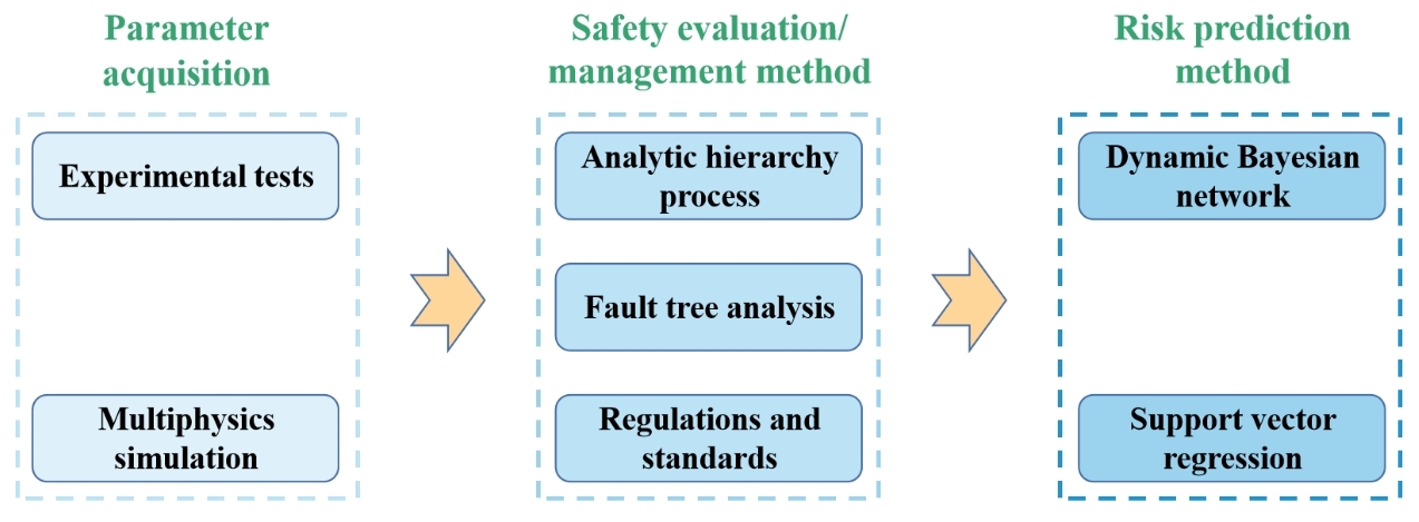 作为优异的电能存储装置,锂离子电池被广泛应用于现代电子设备、电动汽车、储能系统等领域,有效推动了国家经济增长,改善了生产生活水平。然而,锂离子电池的安全风险仍然如鲠在喉,电池热失控引发的火灾、爆炸事故仍被时常报道,给社会、人员以及环境等造成了较大损失。因此,锂离子电池安全及灾害防护一直吸引着工业界、学术界的广泛关注。该论文首先详细讨论了典型滥用工况下锂离子电池的热失控特征、影响因素和机制,其中关于机械滥用和电滥用的总结如图1和图2所示;其次,介绍了热失控传播的特点以及各典型因素对热失控传播的影响,阐明了传热和热阻在热失控传播过程中的关键作用;再次,总结了热失控过程中气体和固体产物的特性与生成机制;再次,介绍了如何应用综合多参数法来收集电池参数、划分危险等级、进而进行风险预测并制定风险控制策略,图3为用于识别锂离子电池热失控风险的综合多参数法流程图;再次,总结了抑制锂离子电池热失控的措施,包括改进电池组件的安全性、热失控预警、热失控阻隔以及热失控燃爆抑灭等;最后,论文对锂离子电池安全评估标准、发展多参数融合预警方法、研制高效灭火剂和喷放系统等方面提出了建议与展望。本征安全锂离子电池技术亟待突破,高效的预警定位技术、热管理技术和灭火抑爆技术等对于电池安全风险管控同样具有显著价值。
