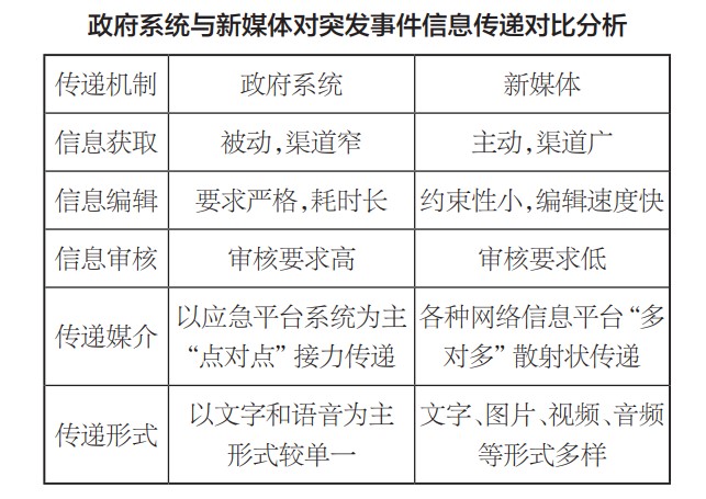 随着信息技术的飞速发展,新媒体时代下突发事件信息传递呈现出新的特点。 传递媒介变“新”。随着互联网技术的快速发展,智能手机等移动终端被广泛普及,媒介形态更替迅速,信息传递媒介随之发生根本性变化。当前,门户网站、微博、微信等现代信息平台已成为社会公众及时快捷的信息共享渠道,突发事件信息传递媒介已从政府平台、官方主流媒体等逐渐发展为以门户网站、微博、微信、视频共享平台等网络新媒体为主。 传递速度变“快”。新媒体时代下,微信、微博、 论坛等新媒体信息平台具有使用门槛低、便捷性强、 传播力大等特点,突发事件信息传递更加快速。在网络可使用条件下,公众可随时获取和分享需要关注的信息,人人都是信息的发现者、报告者、接收者、 传播者,任何信息的出现,在短时间内就可被千万公众获取,信息传递主体、内容、数量和时效均呈现几何级数增长。 传递内容变“多”。传统突发事件信息传递内容主要来源于政府官方发布,内容真实、客观、完整, 表达严肃、权威、正式。新媒体时代,突发事件信息来源广泛,信息内容多呈现主观化、零散化、碎片化, 部分信息存在主观臆断和断章取义,信息表述方式口语化,并伴有图片、视频,更加生动形象,更具直 观性。 传递范围扩“大”。新媒体时代下,突发事件信息传递与传统信息传递相比,传递范围呈散射状,从根本上打破了“一对一”个人参与社会传递的传统格局,转为“一对多”、“多对多”的信息传递格局,消 除了信息传递的空间界限,传递范围无限扩大。 信息传递过程包括信息获取、编辑、审核、传递接收等过程,其中传递媒介和传递形式是传递接收过程的重要组成部分。通过比较,可以发现,政府系统与新媒体两个渠道信息传递机制在信息获取、信息编辑、信息审核、信息传递媒介、信息传递形式等五方面存在差异(见下表)