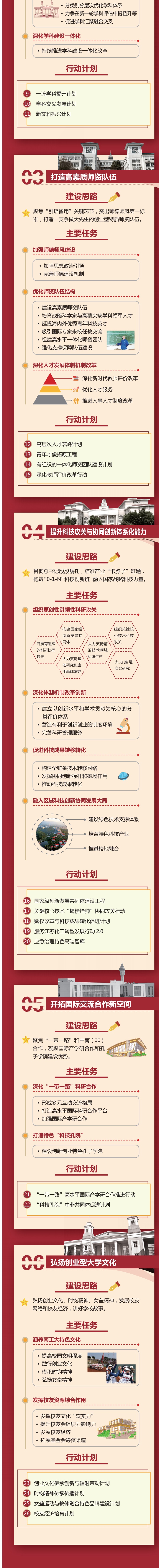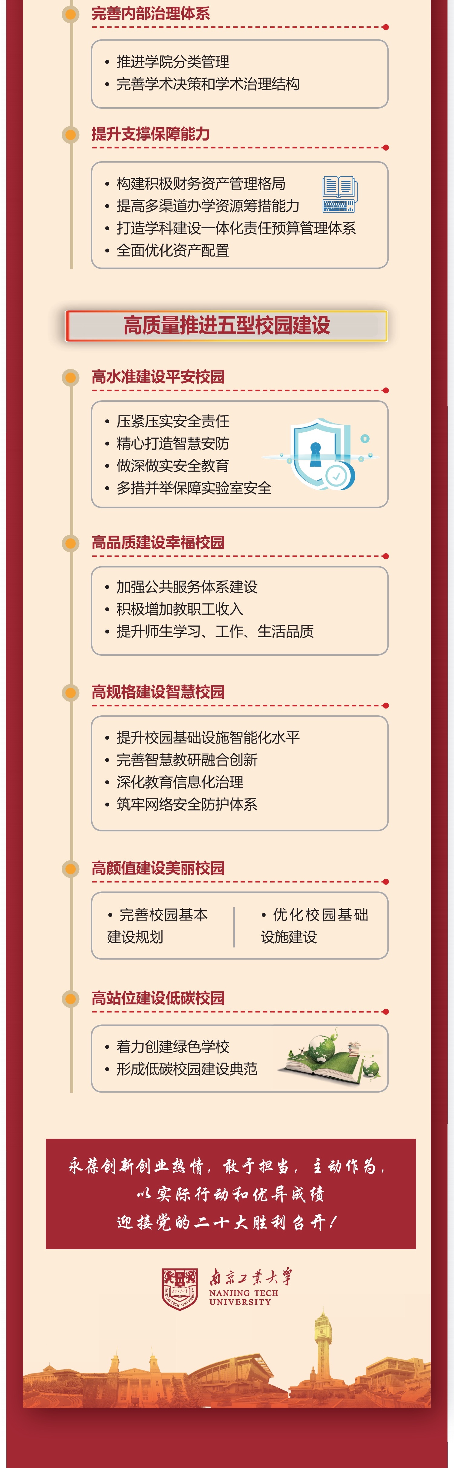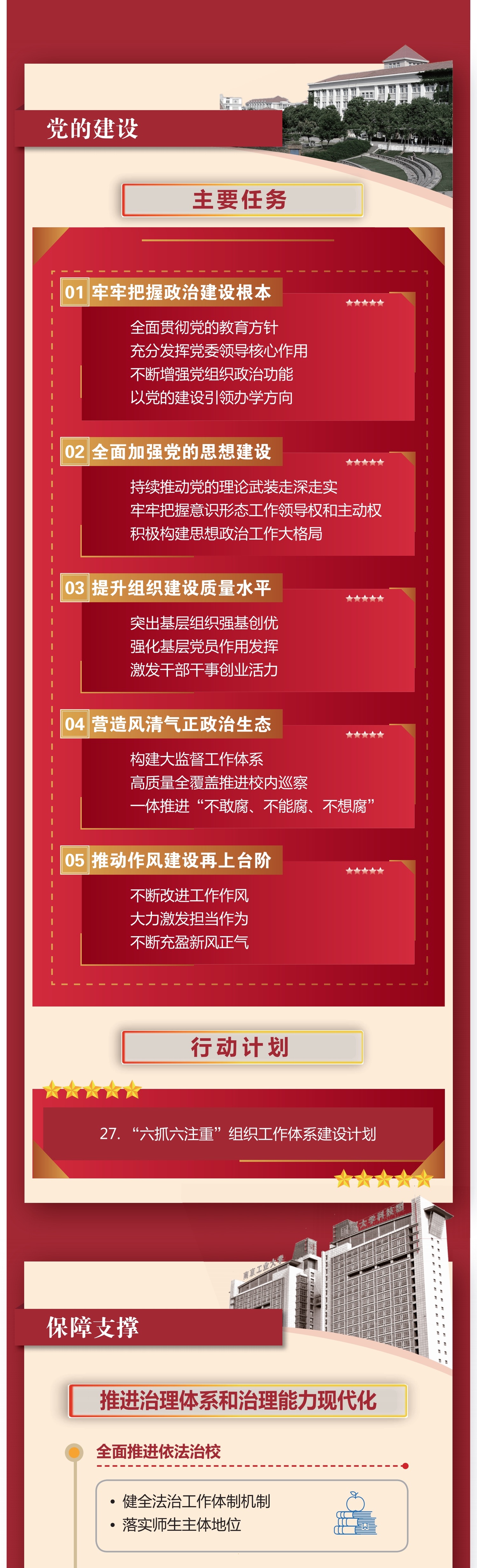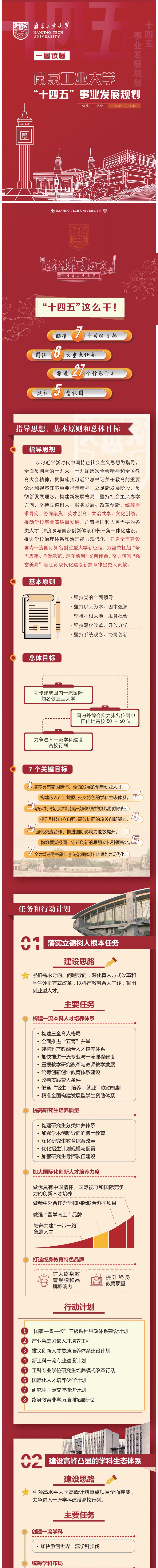 《规划》总计3.6万字,分为发展环境、主要目标、主要任务、保障支撑、组织实施五个部分,是公司“十四五”发展规划体系的统领。《规划》确立了初步建成国内一流国际知名创业型大学的“十四五”发展目标和70余项主要指标。《规划》提出,重点推进落实立德树人根本任务、建设高峰凸显的学科生态体系、打造高素质团队队伍、提升科技攻关与协同创新体系化能力、开拓国际交流合作新空间、弘扬创业型大学文化等六大重点任务,坚持与江苏省高水平大学建设高峰计划联动,重点实施27个行动计划。《规划》明确,全面加强党的领导,推进治理体系和治理能力现代化,高质量推进平安校园、幸福校园、智慧校园、美丽校园、低碳校园等五型校园建设。